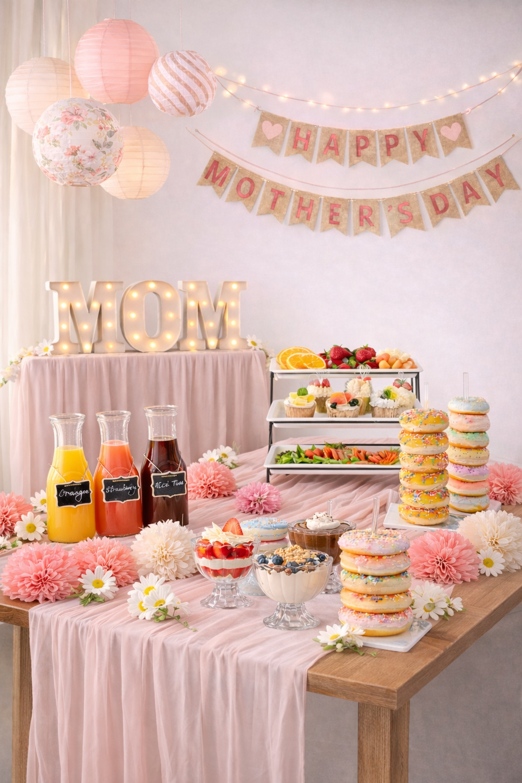 Affordable items like Mother’s Day banners, paper lanterns, and tissue pop-poms can create a beautiful setting without overspending.